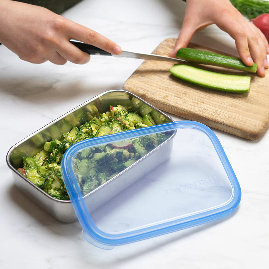 • Tamaño del recipiente de 45oz/1330ml con tapa puesta: 8.6" x 5.9" x 2.5" (21,84 x 15 x 6,35 cm). La tapa se adapta a todos los recipientes rectangulares de 45 oz de U-Konserve