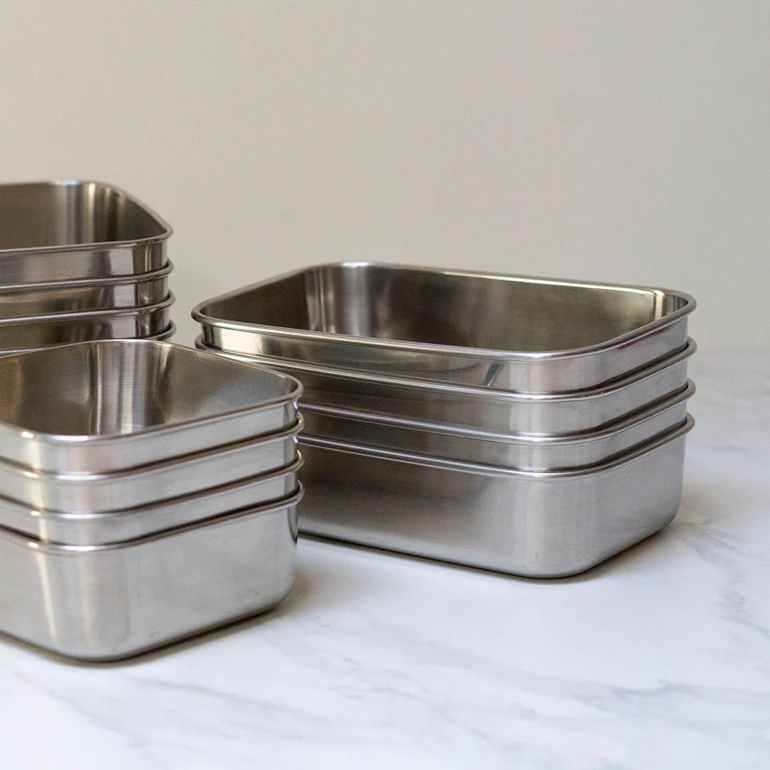 Nuestros recipientes rectangulares de acero inoxidable con tapas de silicona ofrecen una solución para empacar bocadillos, almuerzos y comidas principales mientras se reduce el uso de envases desechables. Con tapas flexibles fáciles de abrir y una característica a prueba de fugas, estos recipientes reutilizables son perfectos para el hogar y el movimiento, contribuyendo a la reducción de basura.