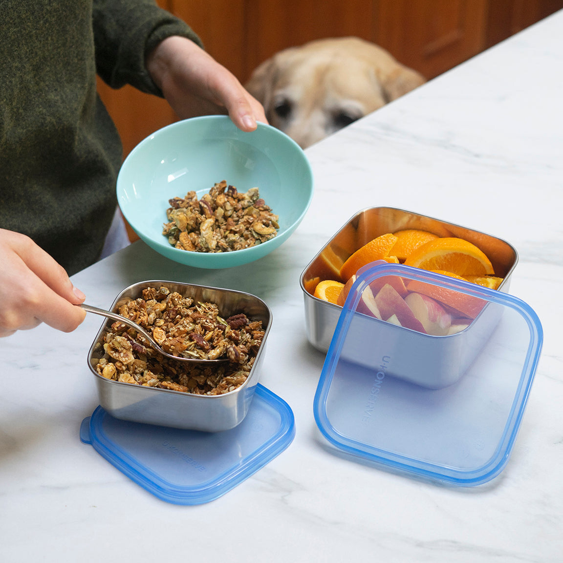 - Tamaño del recipiente de 900 ml/30 oz con tapa: 14,6 x 6,3 x 14,6 cm (tamaño sándwich). La tapa se adapta a todos los recipientes cuadrados de 900 ml/30 oz de U-Konserve.